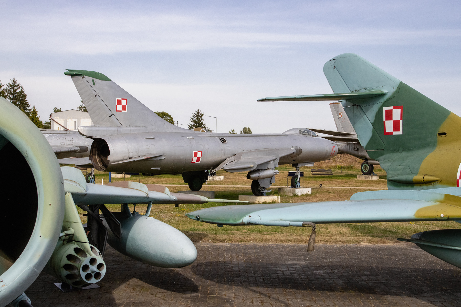A row of fighter jets at the Muzeum Sił Powietrznych w Dęblinie (Aviation Museum in Deblin), Poland. Starring in the front is the Sukhoi Su-22UM3K, NATO code name Fitter, nr 605 that served the Polish Air Force from Swidwin Air Base.,
