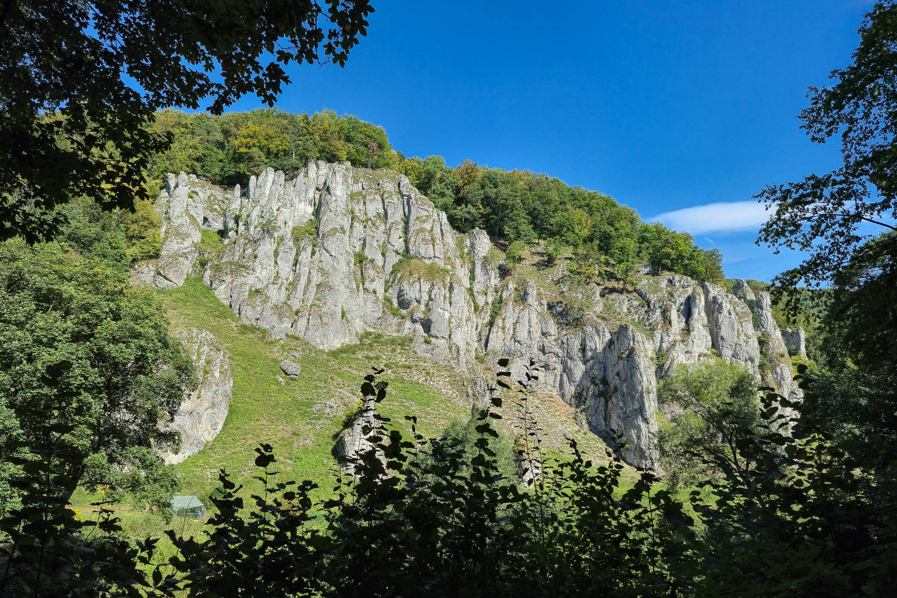 Limestone cliffs, some accessible via foot paths to the top, dwarf humans in the valley below.